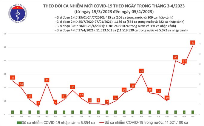 Về tình hình dịch COVID-19 hôm nay, Bộ Y tế cho biết từ 16 giờ ngày 4-4 đến 16 giờ ngày 5-4, cả nước ghi nhận 51 ca mắc, cao nhất trong nhiều tháng qua. Đây là ngày thứ 3 liên tiếp, số ca mắc tăng cao so với các ngày của nhiều tuần trước đó.