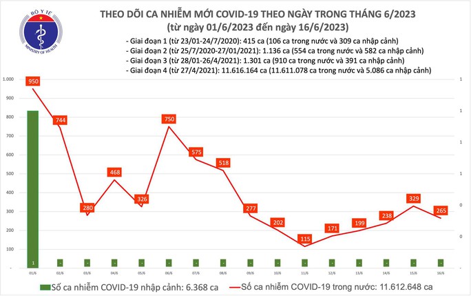 Về tình hình dịch COVID-19 hôm nay, Bộ Y tế cho biết từ 16 giờ ngày 15-6 đến 16 giờ ngày 16-6, cả nước ghi nhận 265 ca nhiễm, giảm nhẹ sau nhiều ngày liên tục tăng.